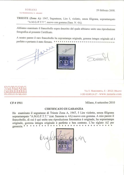 TRIESTE A 1947 Segnatasse. 5 lire violetto, senza filigrana, bordo di foglio su