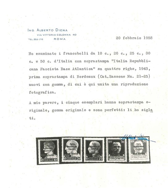 Serie completa di 5 valori con prima soprastampa di Bordeaux "Italia / Repubblicana / Fascista / Base Atlantica"