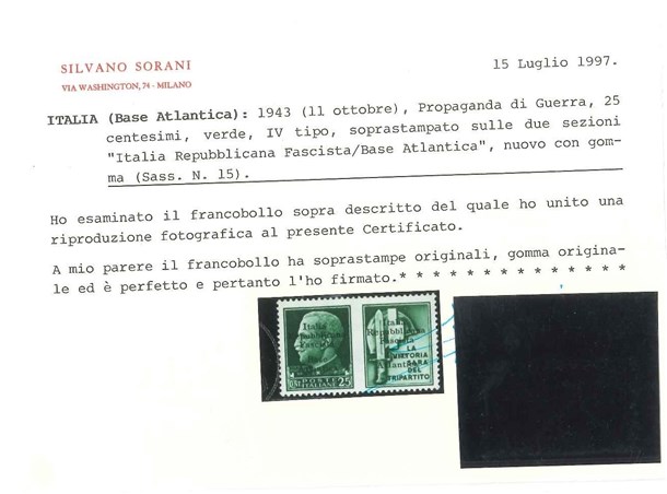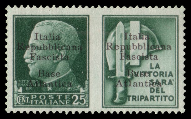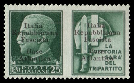 Propaganda di guerra. 25c. verde "Milizia" con seconda soprastampa di Bordeaux "Italia / Repubblicana / Fascista / Base Atlantica"
