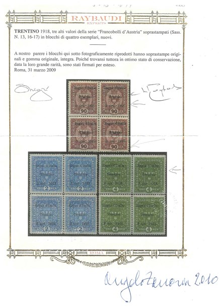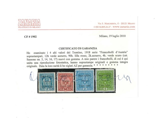 TRENTINO 1918 Francobolli d'Austria soprastampati. I 4 alti valori della serie