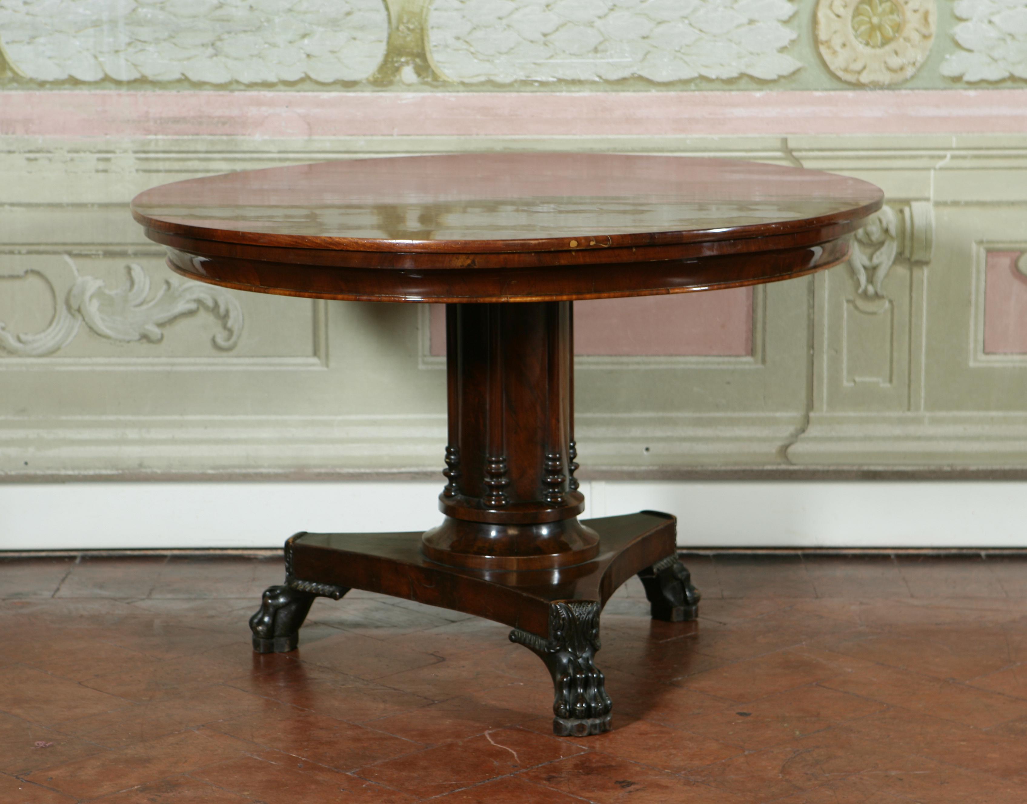 MANIFATTURA FRANCESE DEL XIX SECOLO Tavolo in mogano rotondo con gamba...