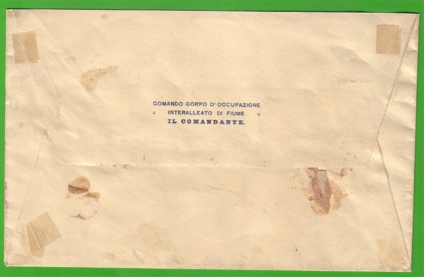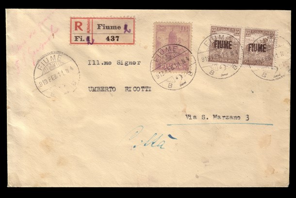 FIUME 1919 (11 feb.) Busta raccomandata da Fiume per città, affrancata per 55c.