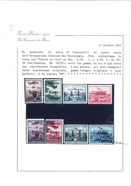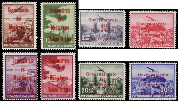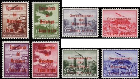 Posta aerea. Serie completa di 8 valori, soprastampata in rosso "Governatorato / del / Montenegro / Valore in Lire"