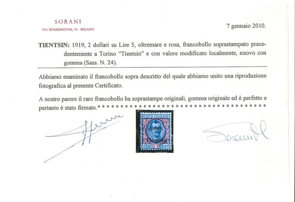 Lot 421 | TIENTSIN 1919 Uffici postali in Cina $2/5 lire oltremare e rosa, soprastampato