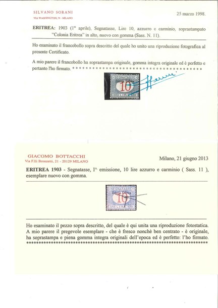 Segnatasse. 10 lire azzurro e carminio soprastampato "Colonia Eritrea" in alto