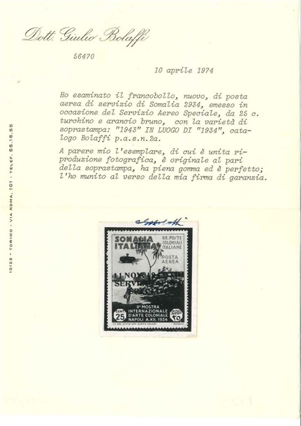 SOMALIA 1934 Varietà posta aerea di servizio. 25c. indaco e bruno arancio sopra