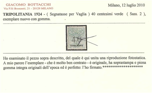 TRIPOLITANIA 1924 Segnatasse vaglia. 40c. verde, soprastampa in caratteri picco