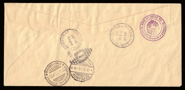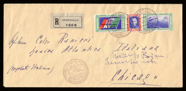 Busta raccomandata (n.1369) da Orbetello, via Reykjavik (5.7), per Chicago (18.7) affrancata con trittico da 5,25+44,75 lire "I-BIAN".