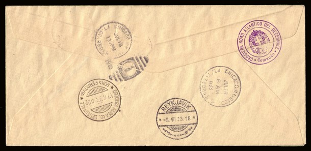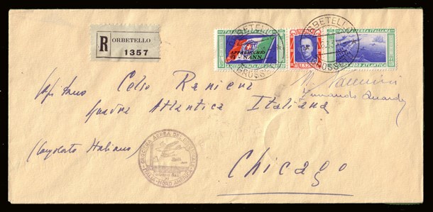 Busta raccomandata (n.1357) da Orbetello, via Reykjavik (5.7), per Chicago (18.7) affrancata con trittico da 5,25+44,75 lire "I-NANN".