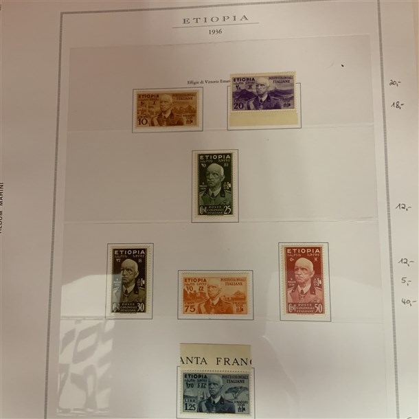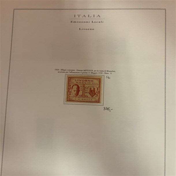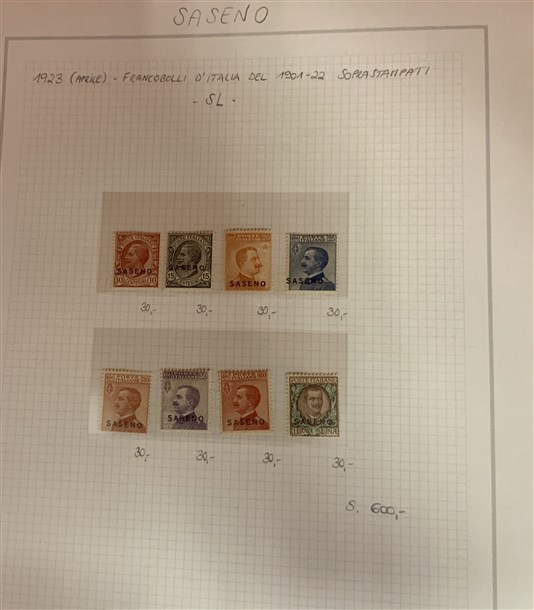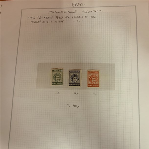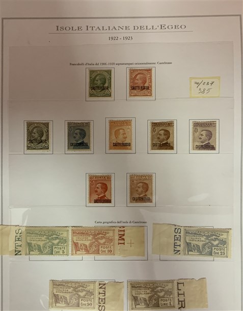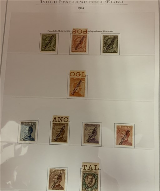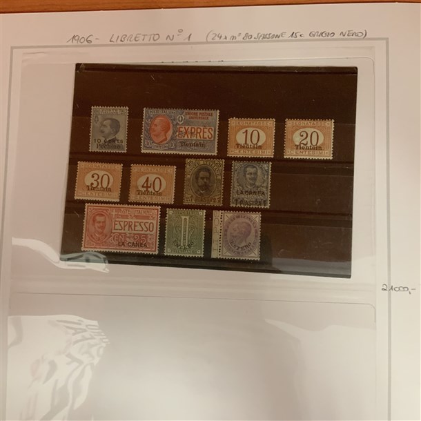 Insieme di collezioni ed esemplari del periodo di Castelrosso, Saseno, Etiopia, Egeo amministrazione greca, uffici all'estero (Pechino, Tientsin, La Canea...), emissioni locali di Livorno. Montati su fogli d'album e cartoncini. Materiale di ottima qualità. Da esaminare
