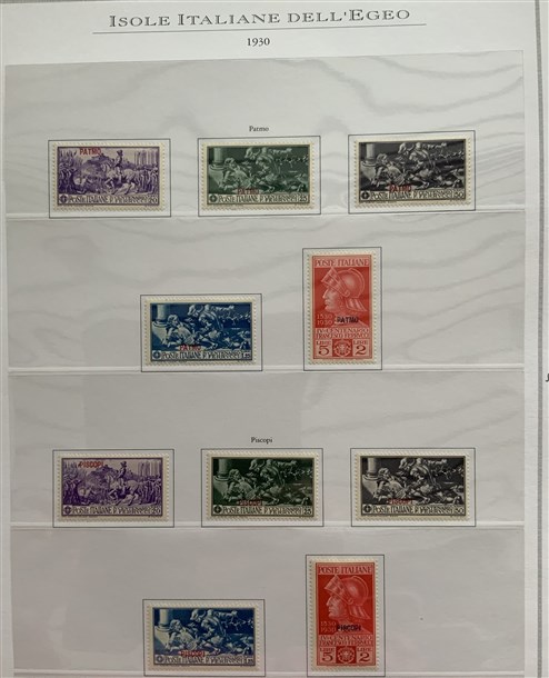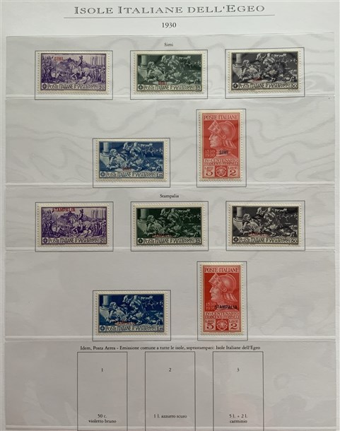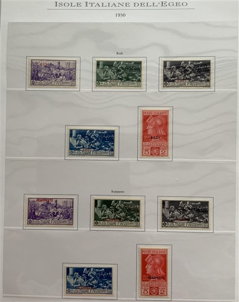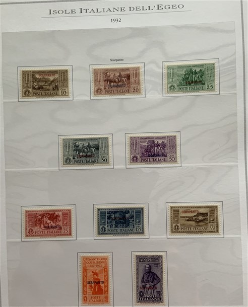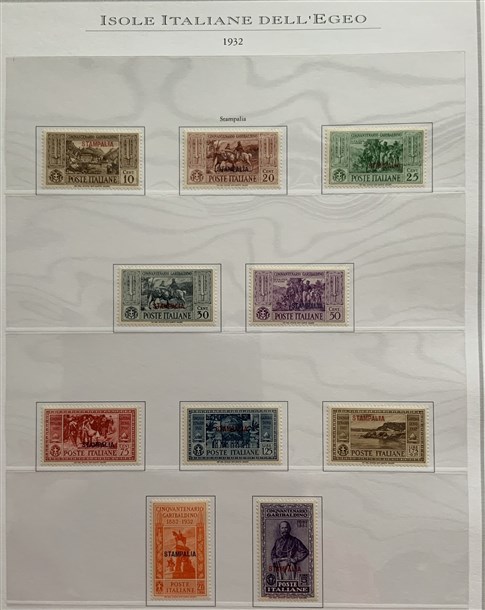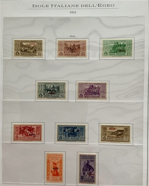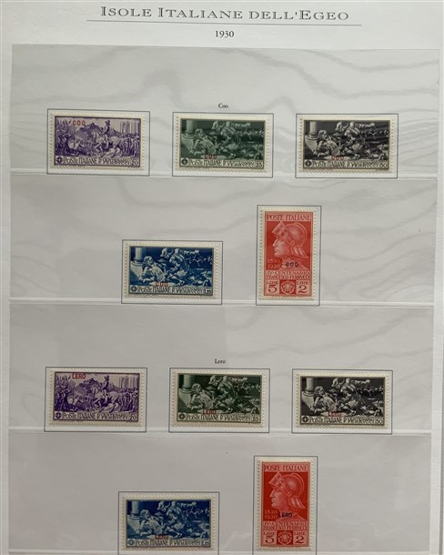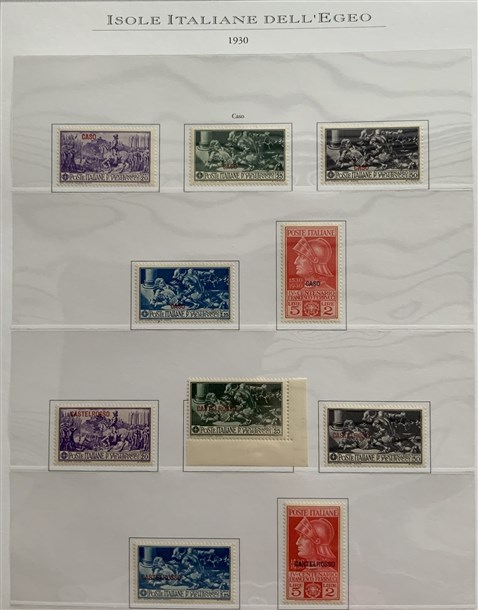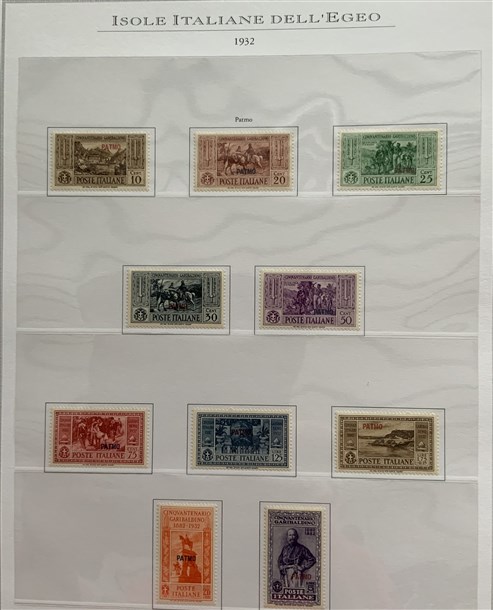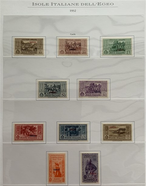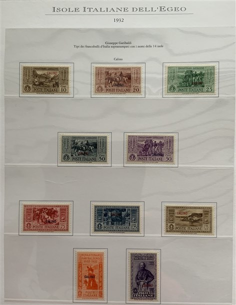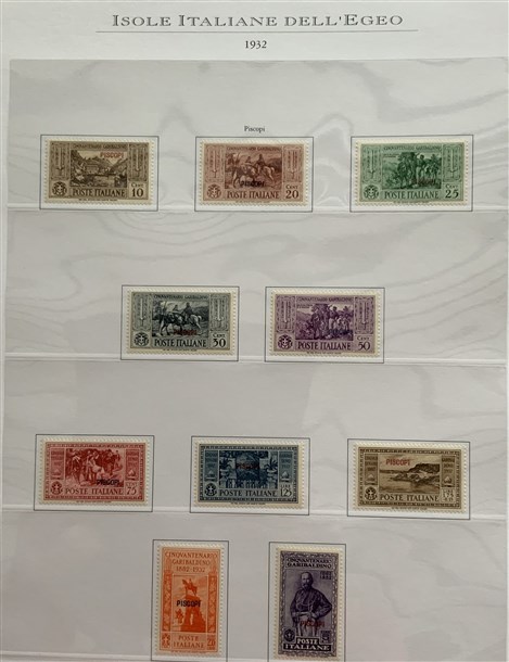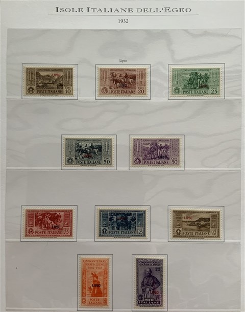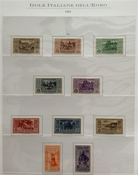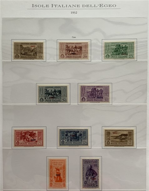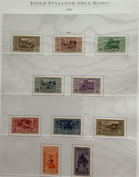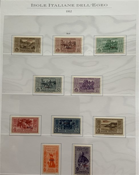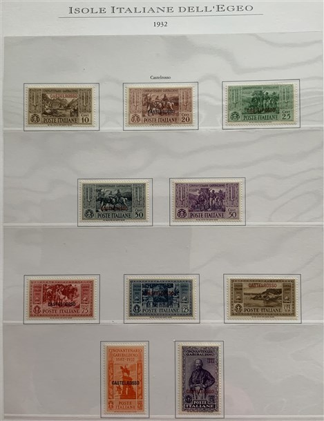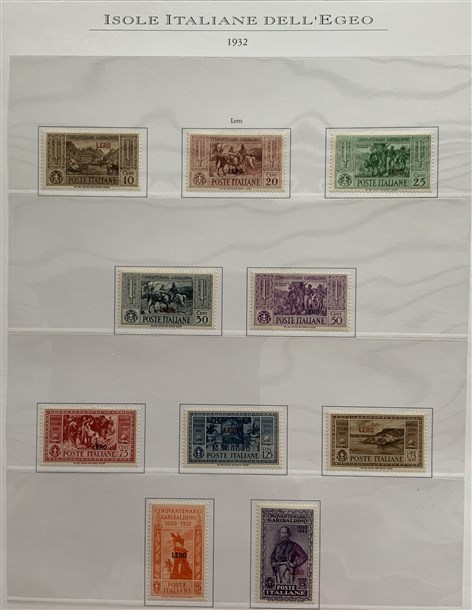 Collezione formata dai giri delle 13 isole dell'Egeo e Castelrosso delle serie "Francesco Ferrucci" e "Giuseppe Garibaldi". Materiale di ottima qualità montato su fogli d'album Marini. Da esaminare