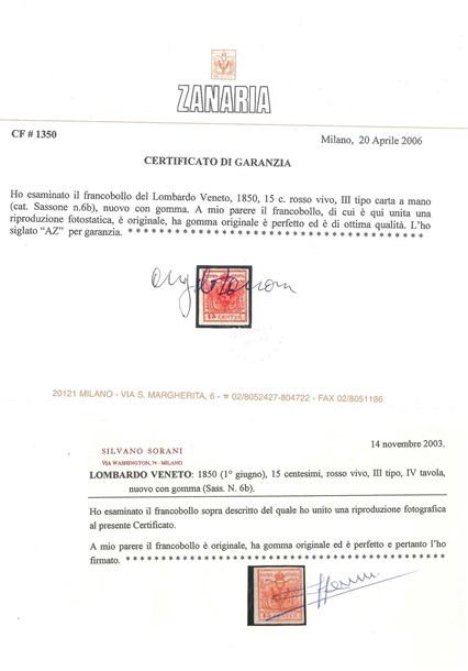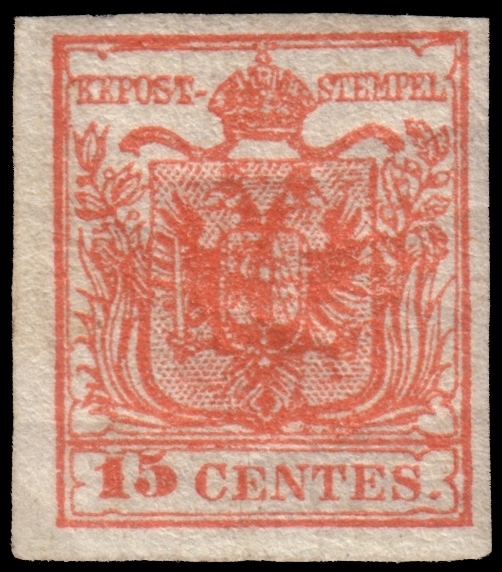 LOMBARDO-VENETO 1850/1854 15c. rosso vivo III tipo, carta a mano Provenienza C