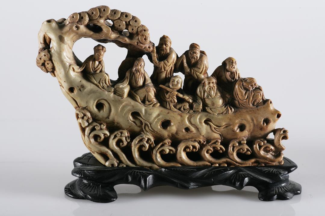 MANIFATTURA ORIENTALE DEL XIX SECOLO Gruppo con personaggi su una barca. Pietra. Cm 13,5x20.