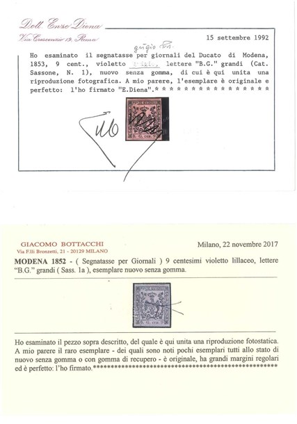 Lot 168 | MODENA 1853 Segnatasse giornali. 9c. violetto lillaceo "B.G." grande Provenien
