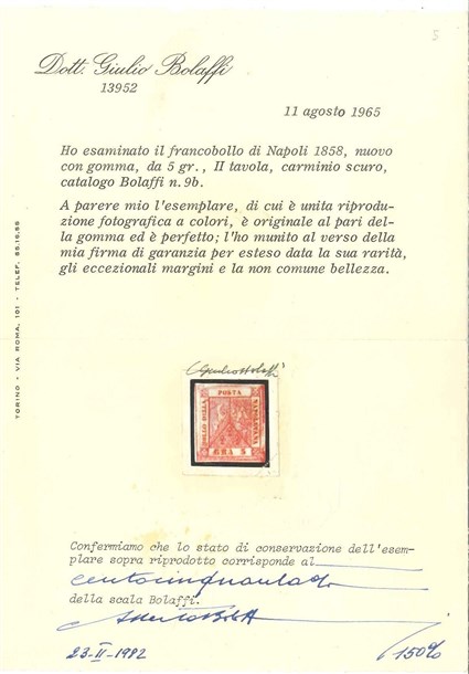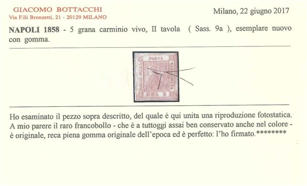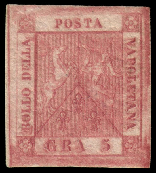 NAPOLI 1858 5gr. carminio vivo, II tavola Esemplare di eccezionale qualità. Pr