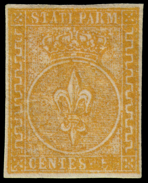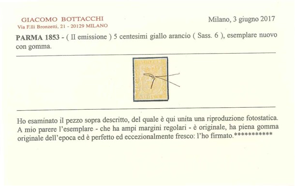 PARMA 1853 5c. giallo arancio Provenienza Collezione "Nimue" Cert. G. Bottac