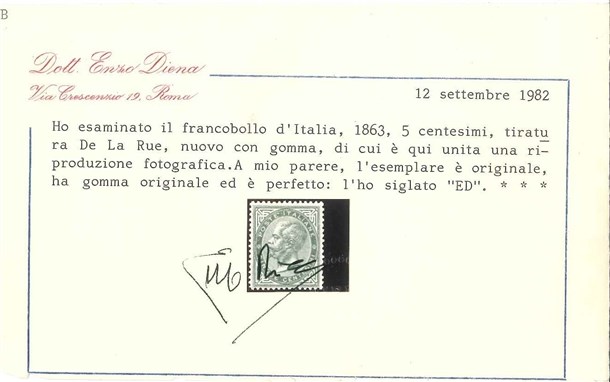 REGNO D'ITALIA 1863/1865 5c. grigio verde, tiratura di Londra Provenienza Coll