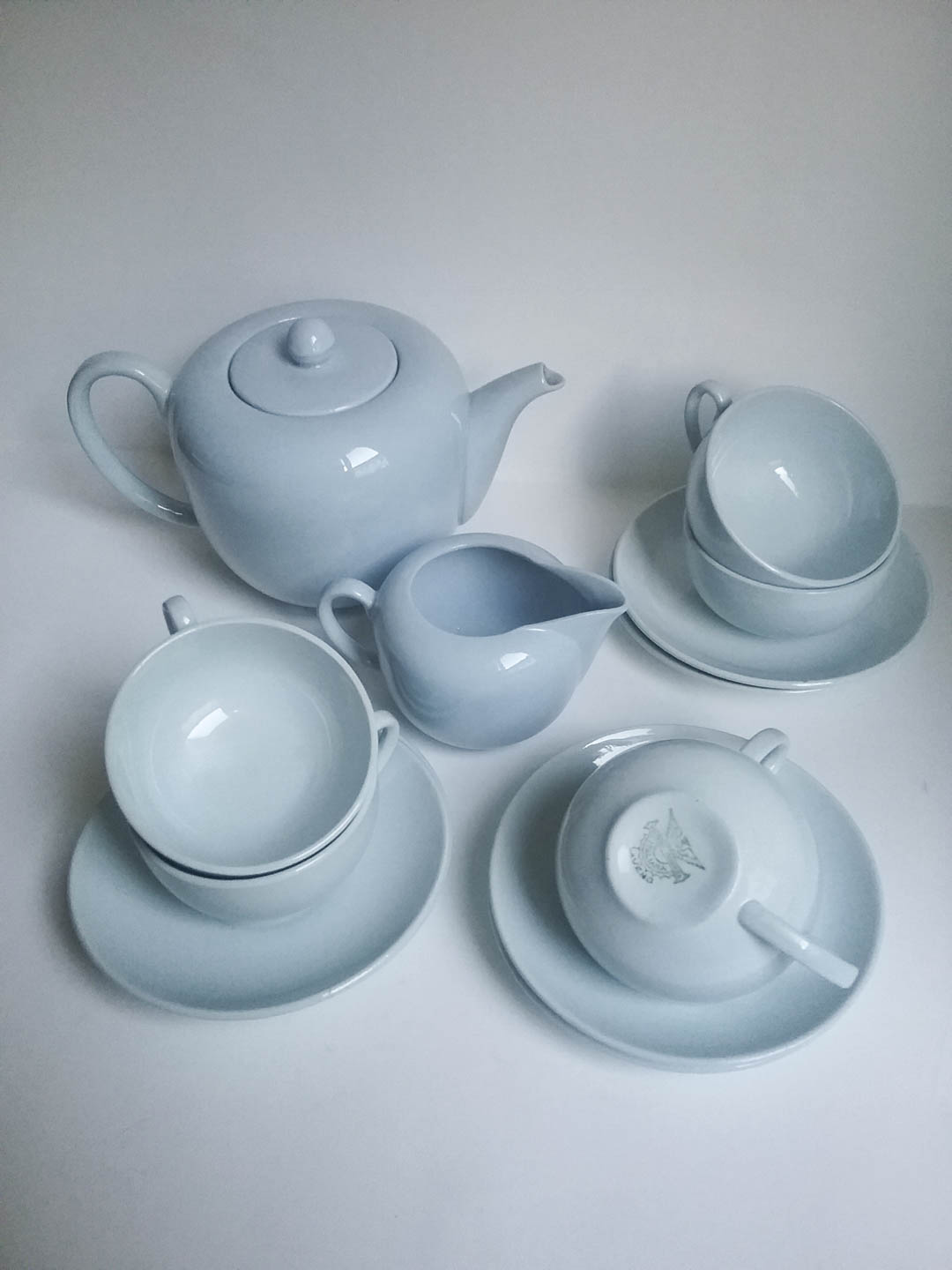 Guido Andloviz (Triest/Trieste 1900 – Grado 1971) Servizio da tè per 6 persone, 1938;con lattiera e teiera della serie "Pomezia" in terraglia azzurra., h. 12 x 23 cm (Teiera),
