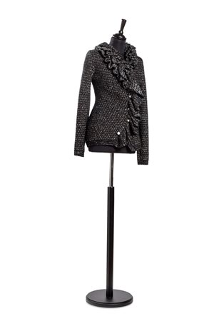 in maglia con collo mosso color nero, inserti colorati, cinque bottoni di perle fancy, tg S