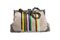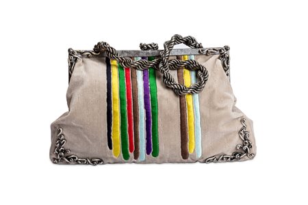 in velluto color beige con decoro a righe colorate, manico a catena in metallo e chiusura a scatto, cm 33 x 22, edizione limitata (lievissimi difetti)in velluto color beige con decoro a righe colorate, manico a catena in metallo e chiusura a scatto, cm 33 x 22, edizione limitata (lievissimi difetti)