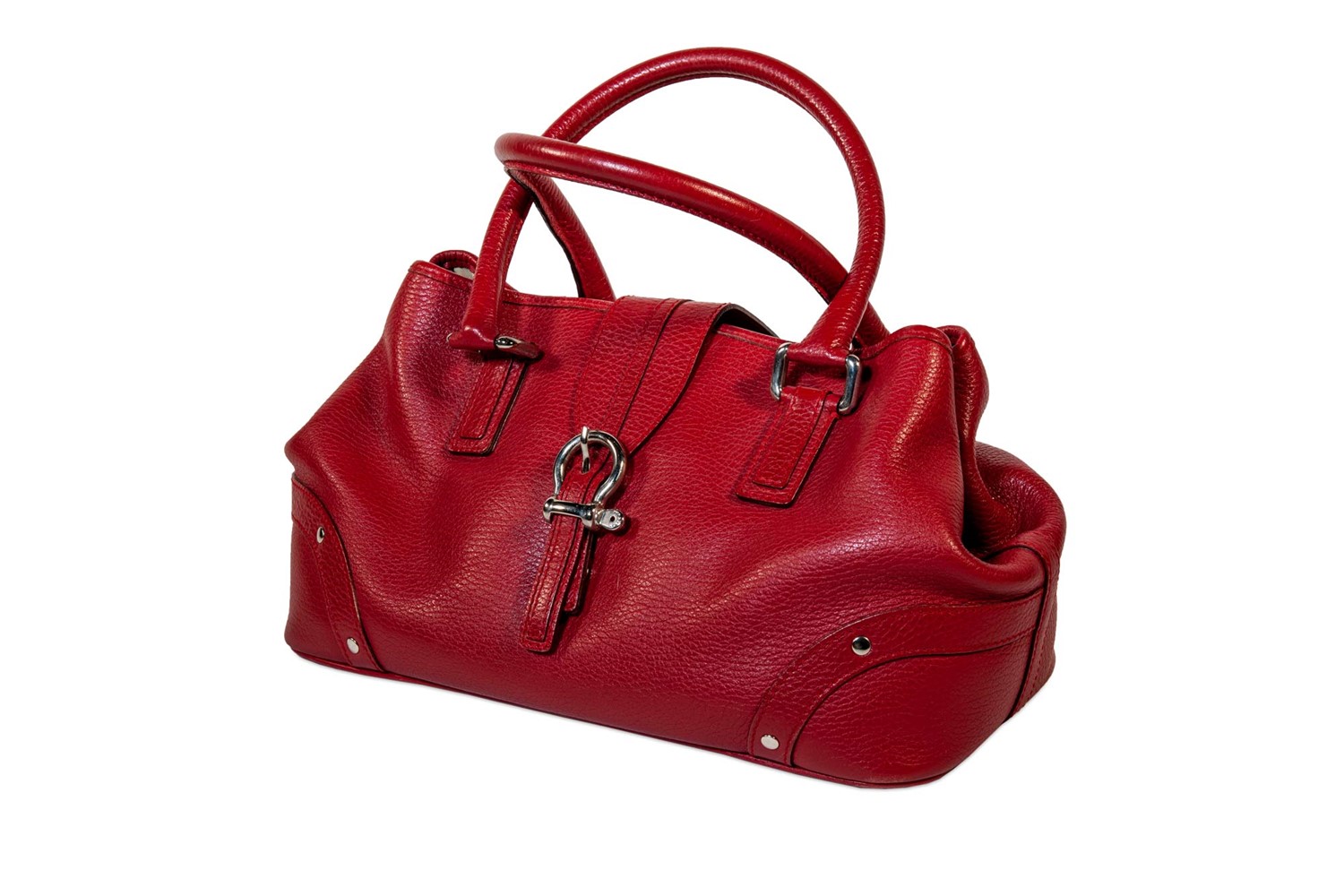 con doppi manici in pelle martellata color rosso, dettagli in metallo, interno in tessuto scozzese, cm 30, con sacchetto (lievi difetti)con doppi manici in pelle martellata color rosso, dettagli in metallo, interno in tessuto scozzese, cm 30, con sacchetto (lievi difetti)