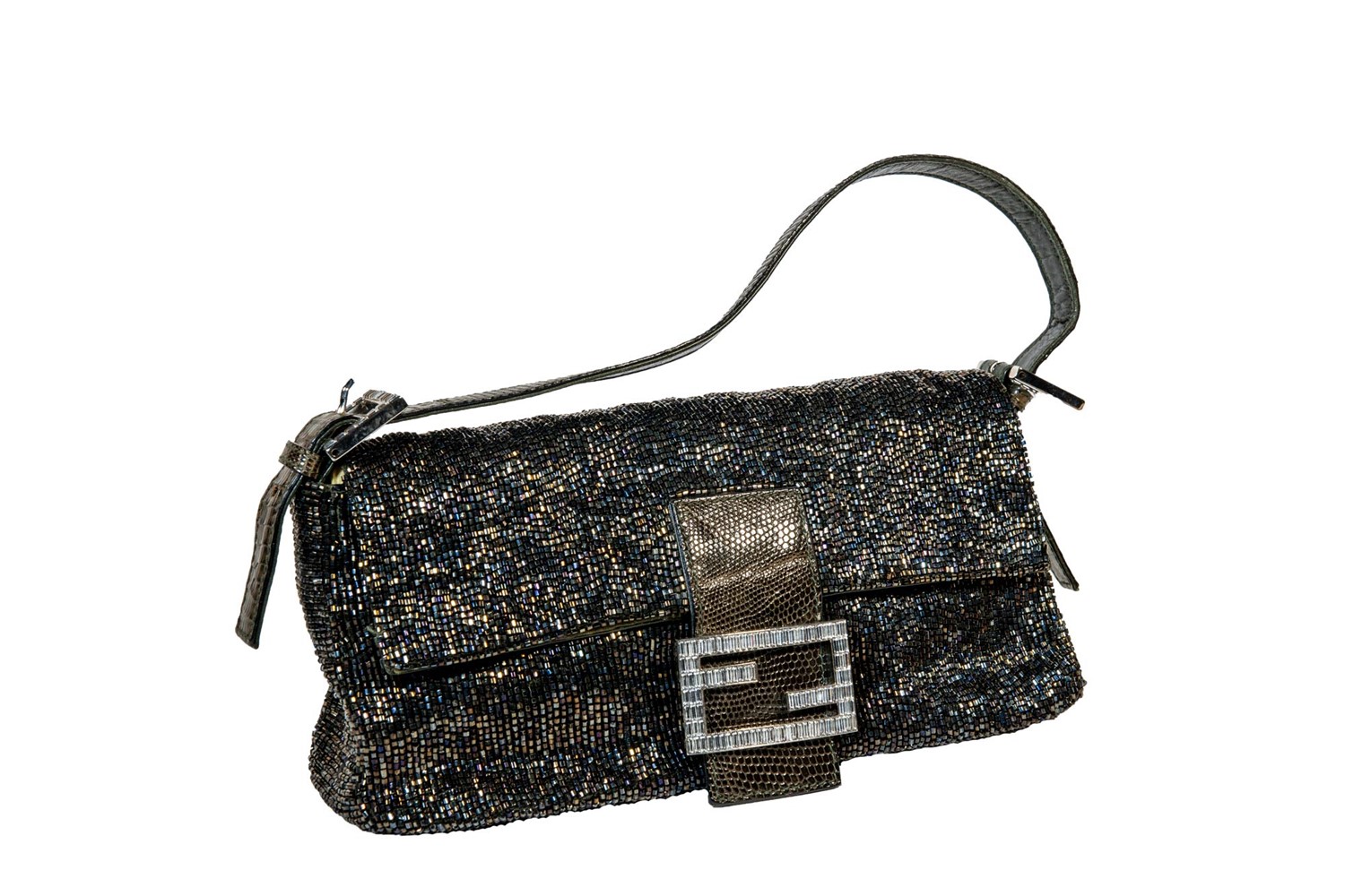 in tessuto interamente ricamato con canottiglie di vetro iridescenti, chiusura a logo in svarowski, cm 25, con sacchetto (lievi difetti all'interno)in tessuto interamente ricamato con canottiglie di vetro iridescenti, chiusura a logo in svarowski, cm 25, con sacchetto (lievi difetti all'interno)