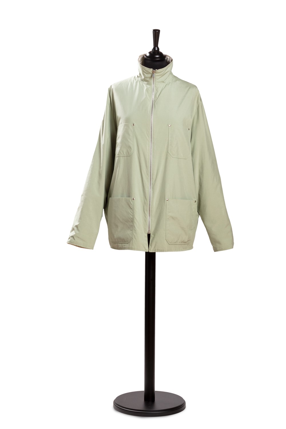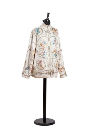 in seta su fondo color bianco, manica lunga, interno color verde con tre tasche, imbottitura e chiusura a zip, Jean de Fougerolles, tg XLin seta su fondo color bianco, manica lunga, interno color verde con tre tasche, imbottitura e chiusura a zip, Jean de Fougerolles, tg XL