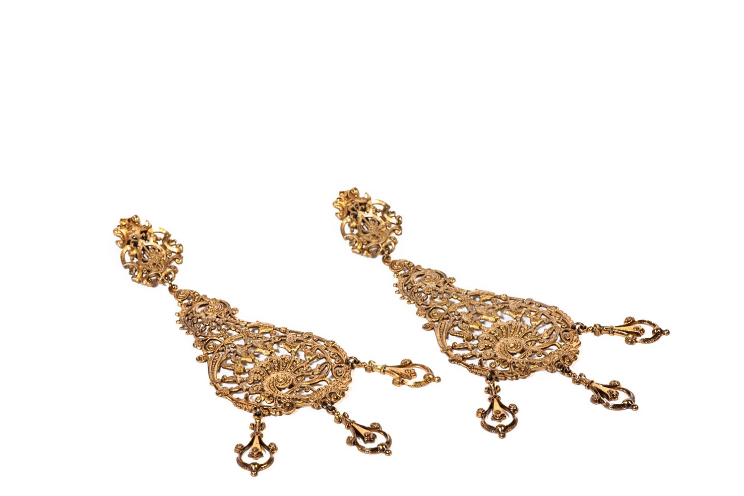 a chandelier con clip a lobo in metallo brunito lavorato a traforo, cm 15 (lievi difetti)a chandelier con clip a lobo in metallo brunito lavorato a traforo, cm 15 (lievi difetti)