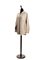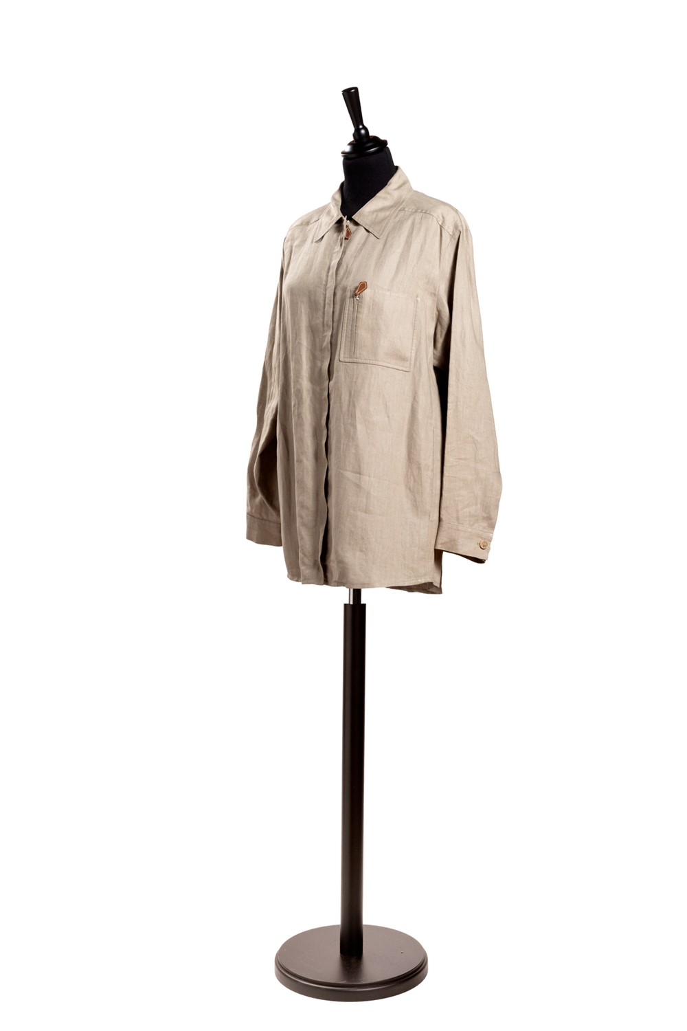 in lino color tortora, dettagli di pelle e chiusura a zip, una tasca applicata e due tasche nascoste, tg 42 francese