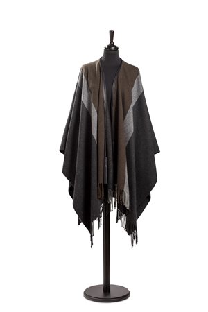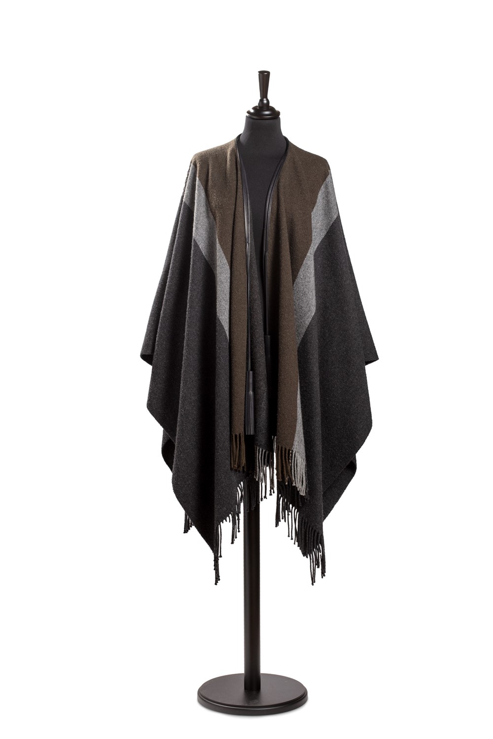 in lana merino e cachemire nella tonalità del grigio, dettagli in pelle di vitello color nero, con pompons a frange, tg unica (lievissimi difetti)