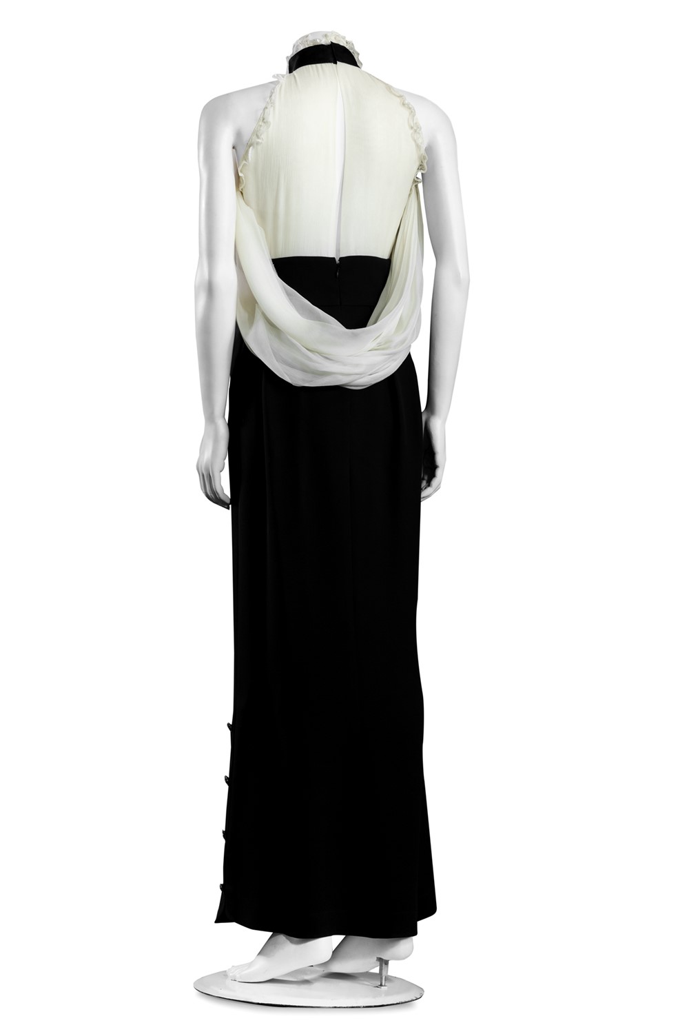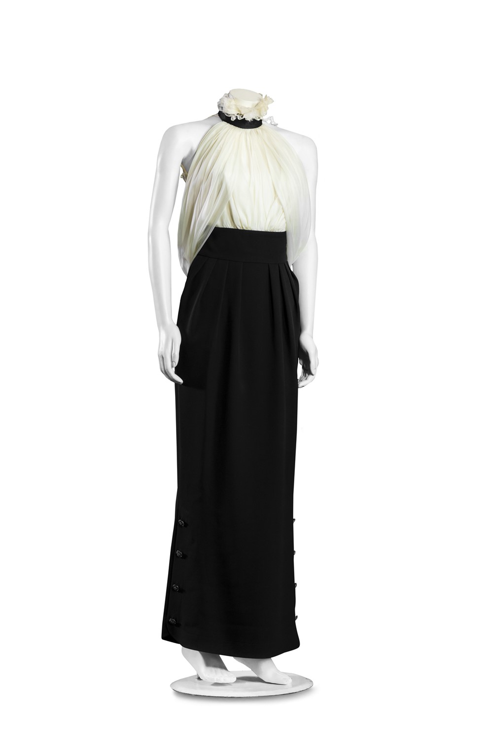 con corpetto in seta color bianco, scollo all'americana e ruches, gonna lunga color blu in seta, otto bottoni gioiello logati in metallo dorato sulla gonna, tg 36 francesecon corpetto in seta color bianco, scollo all'americana e ruches, gonna lunga color blu in seta, otto bottoni gioiello logati in metallo dorato sulla gonna, tg 36 francese