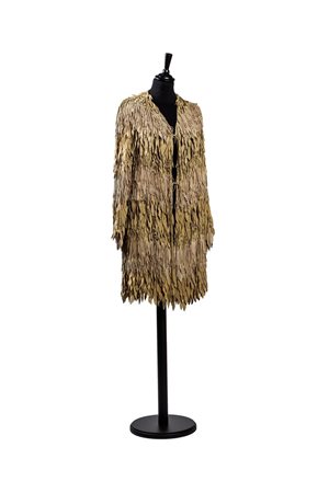 con applicazioni a frangia, con motivi diversi in suede color beige, interno in chiffon, tg 40 italiana