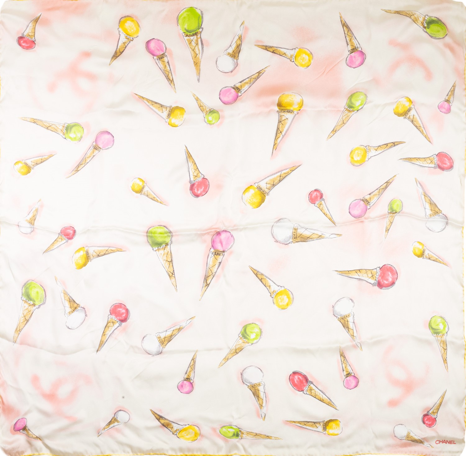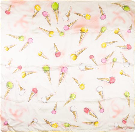 in seta con decoro di gelati su fondo bianco e bordo giallo, cm 85 x 85, con scatola (lievi difetti)in seta con decoro di gelati su fondo bianco e bordo giallo, cm 85 x 85, con scatola (lievi difetti)
