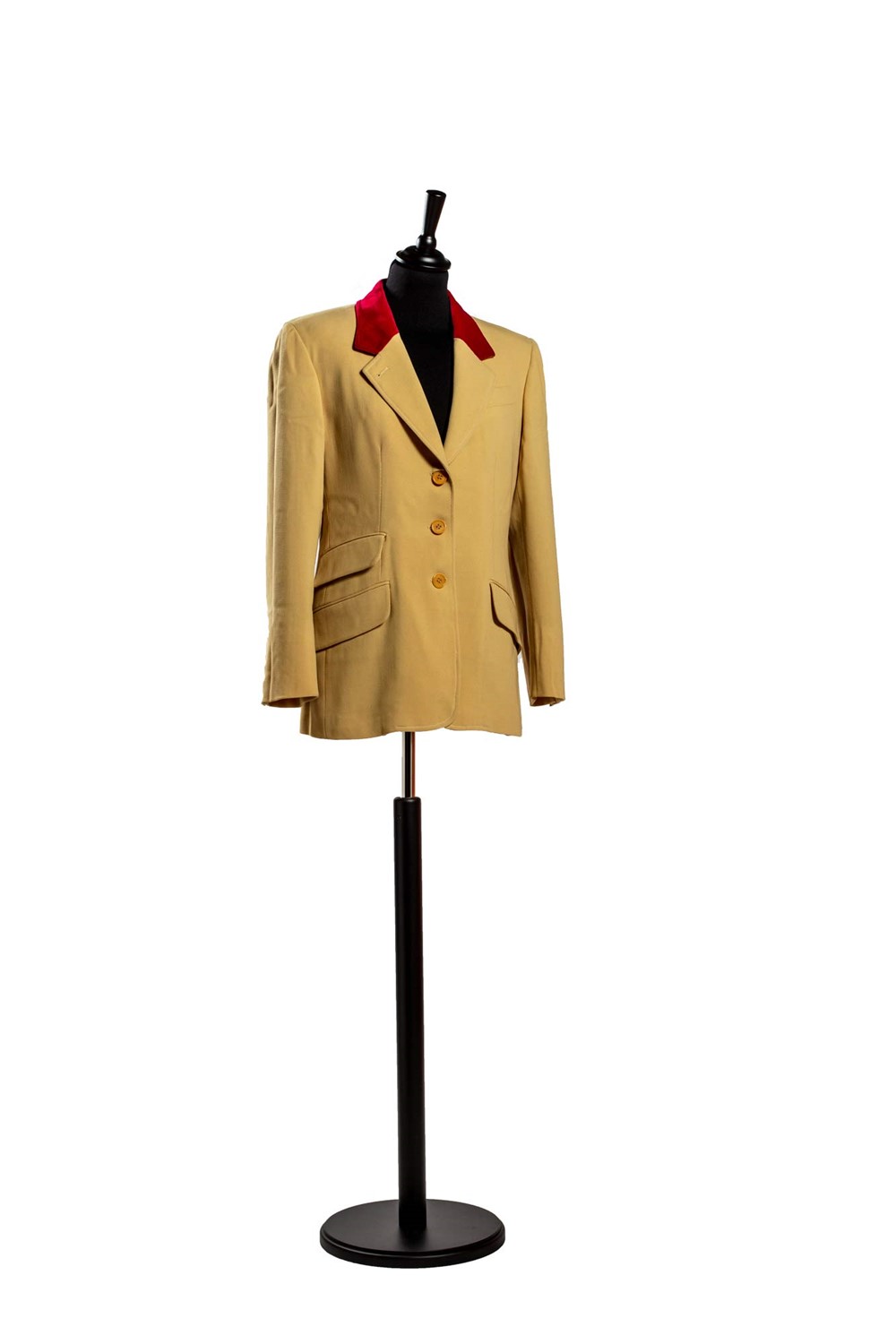 a tre bottoni e tre tasche frontali in lana color caffelatte, colletto del revers in velluto color rubino, bottoni e fodera logati, tg 40 francese (lievissimi difetti)a tre bottoni e tre tasche frontali in lana color caffelatte, colletto del revers in velluto color rubino, bottoni e fodera logati, tg 40 francese (lievissimi difetti)