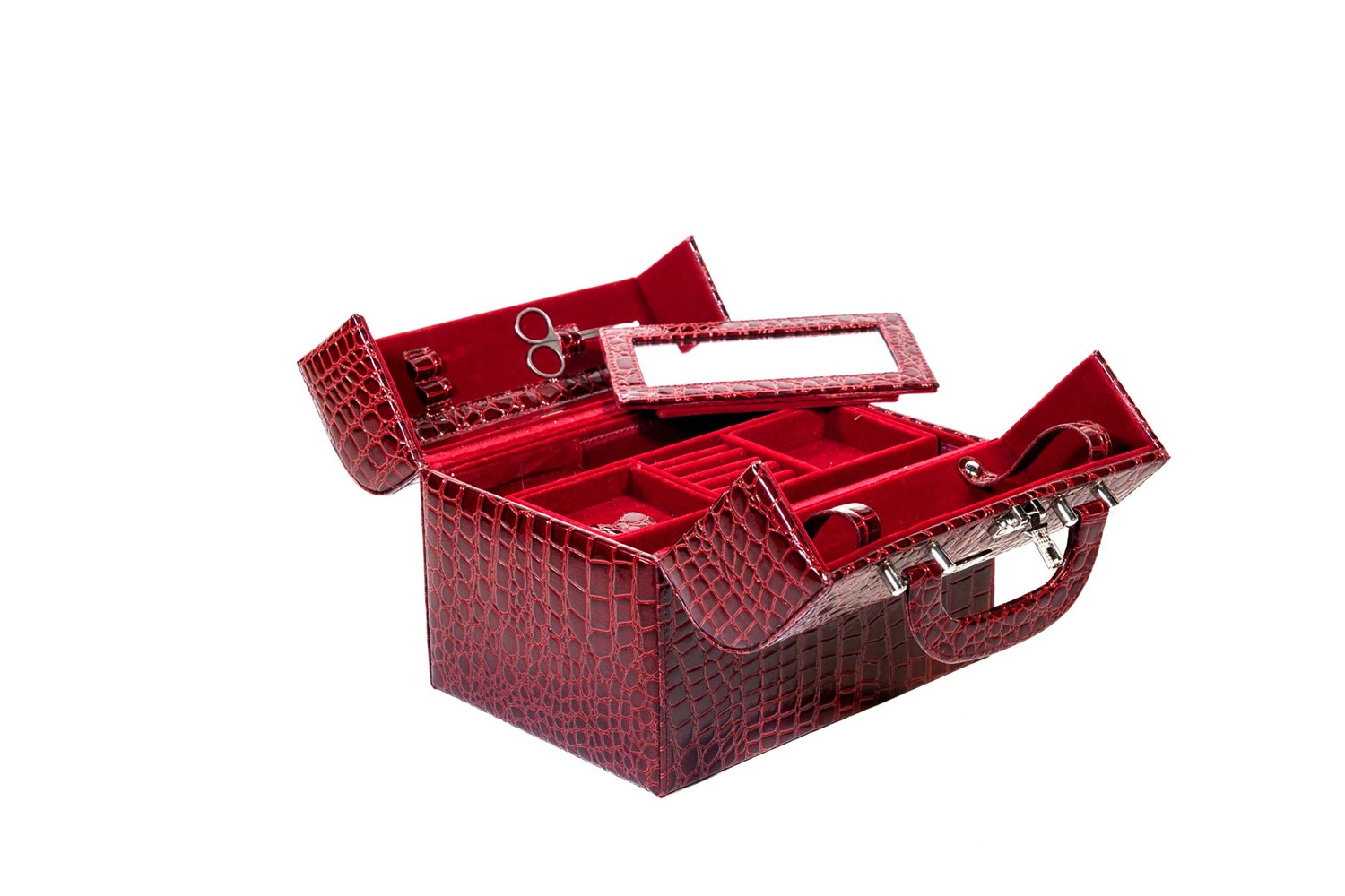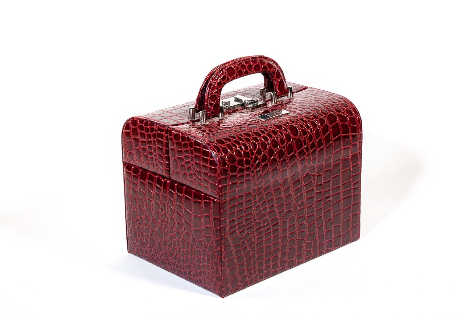 in pelle stampata color rubino, doppi manici, interno in velluto con vari scomparti e accessori, dettagli in metallo, cm 25 x 19 x 20 (lievi difetti)in pelle stampata color rubino, doppi manici, interno in velluto con vari scomparti e accessori, dettagli in metallo, cm 25 x 19 x 20 (lievi difetti)