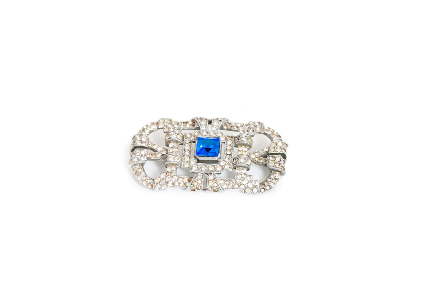 in metallo con pietre di sintesi incolore e una pietra di colore blu