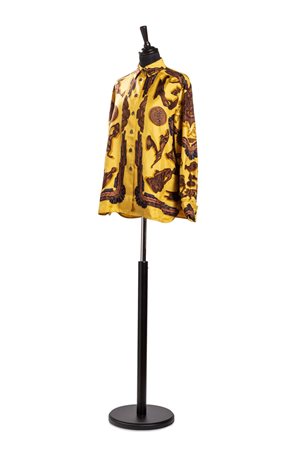 a manica lunga in seta stampa Les Parures du Vent color marrone e blu su fondo color senape, bottoni logati in madreperla, Joachim Metz, tg 40 francese, con scatola (lievi difetti)a manica lunga in seta stampa Les Parures du Vent color marrone e blu su fondo color senape, bottoni logati in madreperla, Joachim Metz, tg 40 francese, con scatola (lievi difetti)