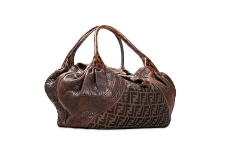 in pelle morbida e tela zucca, doppi manici in pelle di struzzo, dettagli in ottone e apertura con patta e compartimento spia, cm 38 x 48, con sacchetto (difetti)in pelle morbida e tela zucca, doppi manici in pelle di struzzo, dettagli in ottone e apertura con patta e compartimento spia, cm 38 x 48, con sacchetto (difetti)