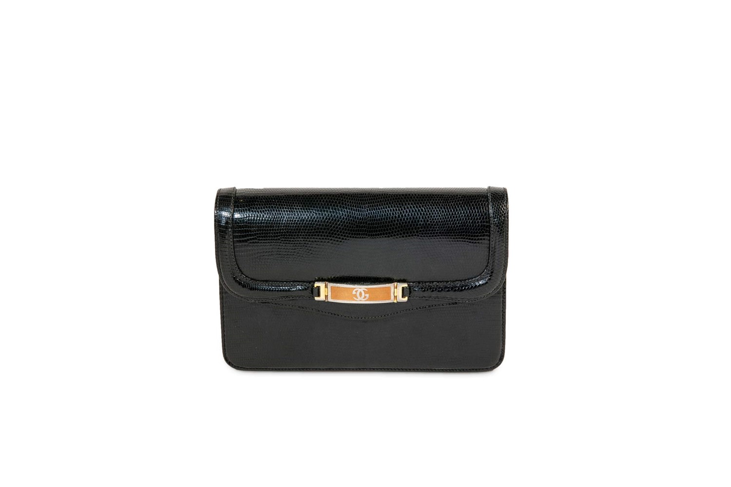 in lucertola color nero, chiusura a pressione, dettagli in metallo dorato e metallo con logo, cm 22,5 x 15 x 6 (difetti e tracolla mancante)in lucertola color nero, chiusura a pressione, dettagli in metallo dorato e metallo con logo, cm 22,5 x 15 x 6 (difetti e tracolla mancante)