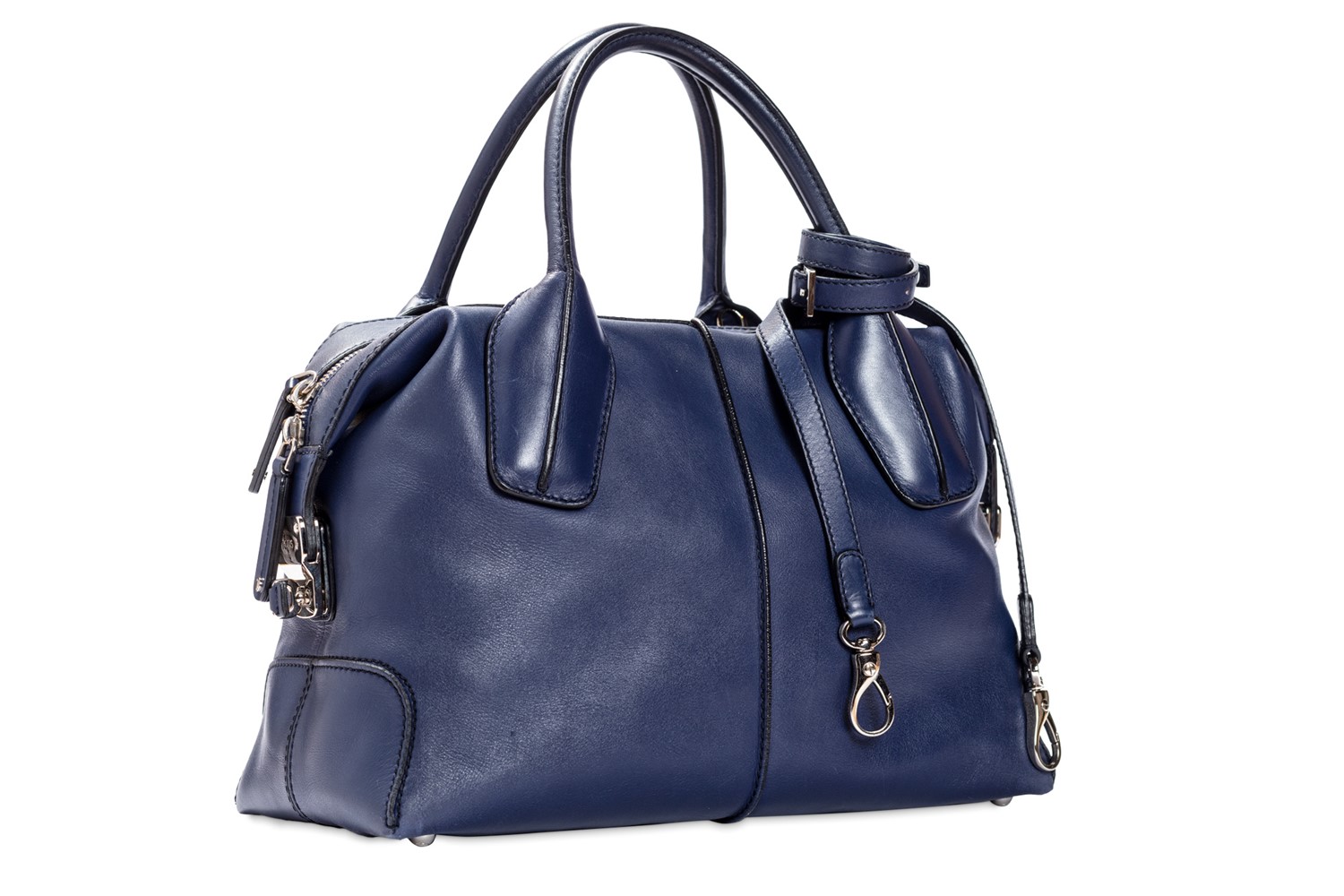 in pelle color blu elettrico, chiusura con zip, con tracolla, interno in tessuto logato, cm 33, con sacchetto (difetti)in pelle color blu elettrico, chiusura con zip, con tracolla, interno in tessuto logato, cm 33, con sacchetto (difetti)