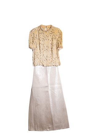 a manica corta in tessuto ricamato con paillettes e perle color bianche, panna e argentate, il vestito lungo color panna, tg M (difetti)a manica corta in tessuto ricamato con paillettes e perle color bianche, panna e argentate, il vestito lungo color panna, tg M (difetti)