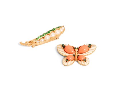a forma di farfalla e baccello di piselli in metallo dorato e satinato, smalti e paste vitree in colori varia forma di farfalla e baccello di piselli in metallo dorato e satinato, smalti e paste vitree in colori vari