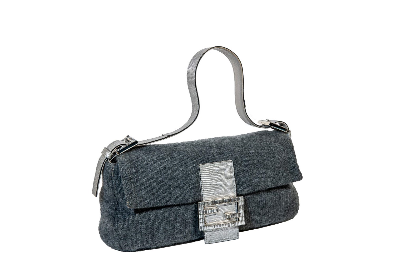 in cachemire color grigio, interno in pelle, chiusura logo in swarovski, cm 25, con sacchetto (lievi difetti)in cachemire color grigio, interno in pelle, chiusura logo in swarovski, cm 25, con sacchetto (lievi difetti)