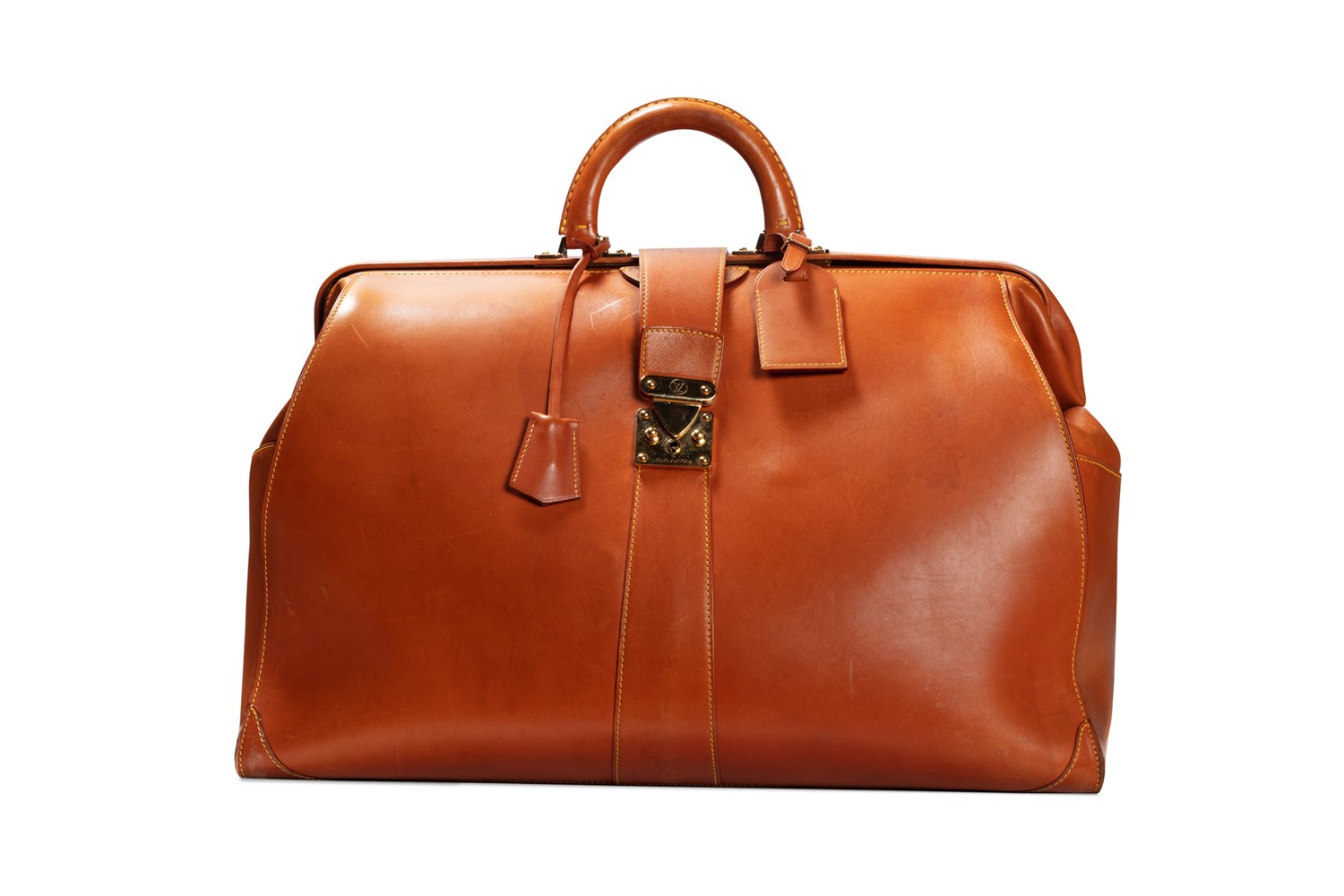 in pelle color cuoio, dettagli in metallo dorato, interno in camoscio color bordeaux, etichetta bagaglio e chiavi, cm 52 x 38 x 27.5 (difetti)in pelle color cuoio, dettagli in metallo dorato, interno in camoscio color bordeaux, etichetta bagaglio e chiavi, cm 52 x 38 x 27.5 (difetti)