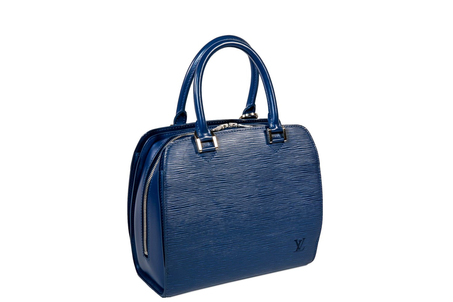 in cuir epi color blu, doppi manici, dettagli in metallo, interno in suede, cm 24,5, con sacchetto (lievi difetti)in cuir epi color blu, doppi manici, dettagli in metallo, interno in suede, cm 24,5, con sacchetto (lievi difetti)