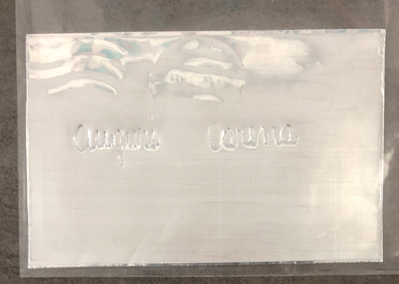 Biglietto augurale in superficie riflettente argento recante dicitura impressa 'Auguri Carena'