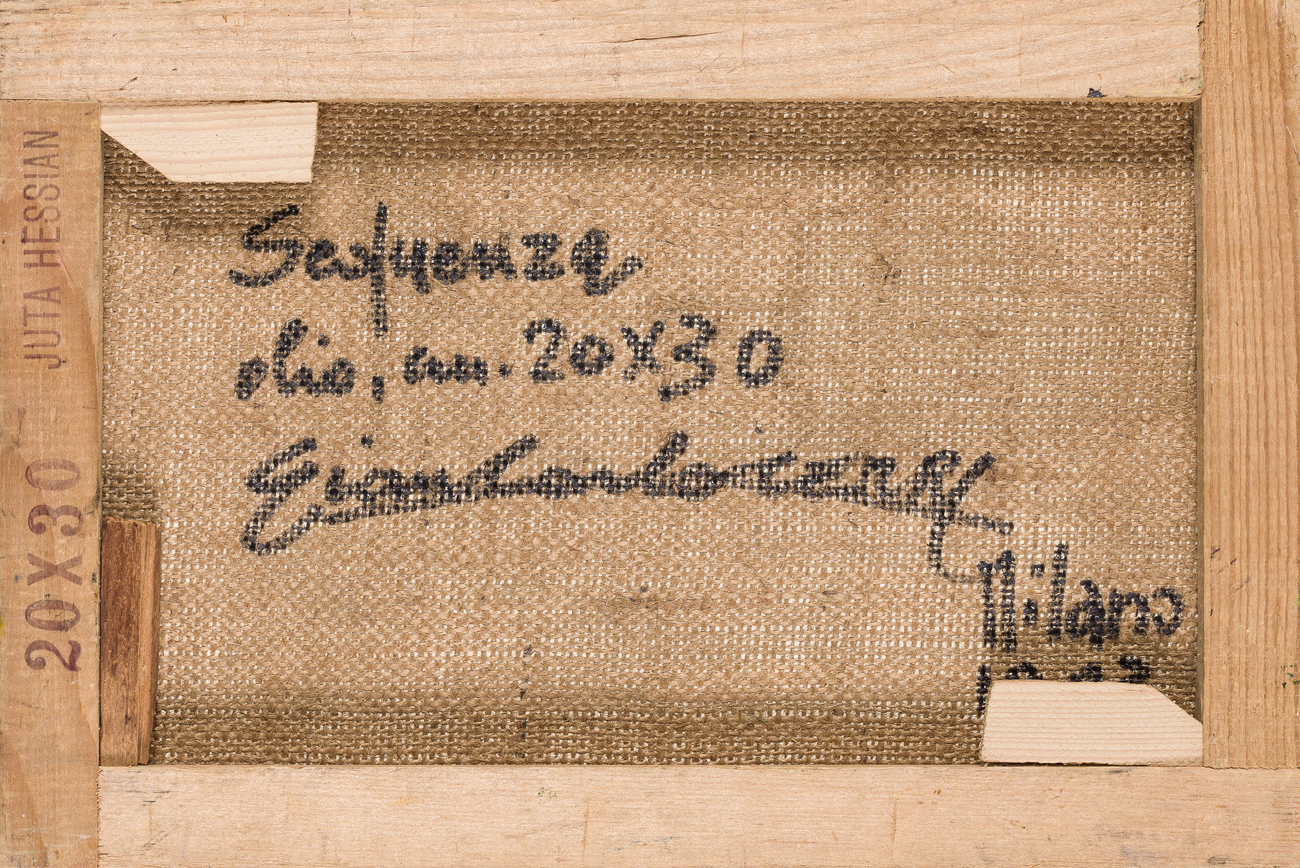 Firma, titolo, tecnica, misure, datazione e località (Milano) al retro