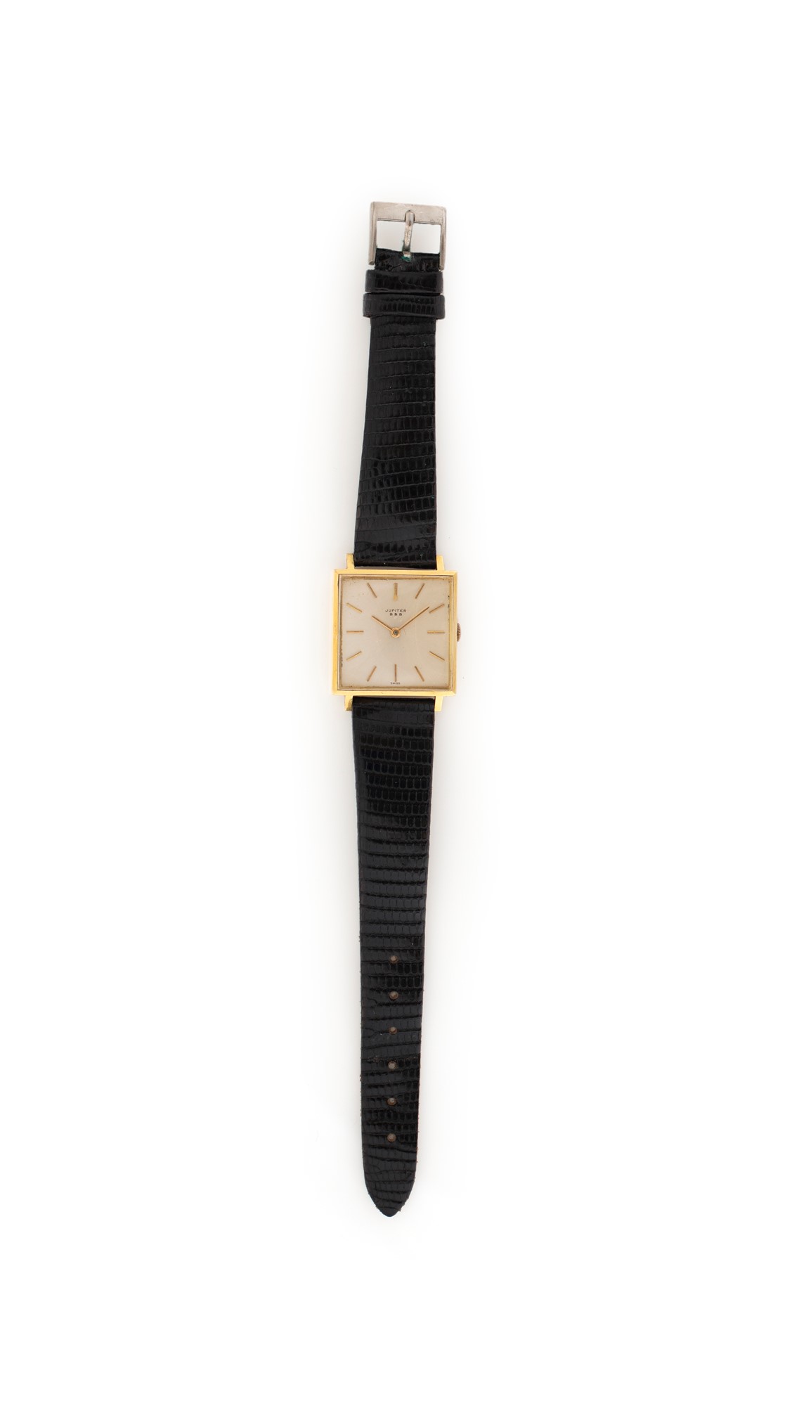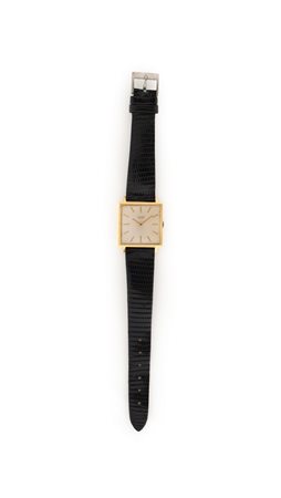 cassa quadrata mm 27 x 27 in oro giallo, movimento svizzero, quadrante perla, cinturino in pelle, funzionante.