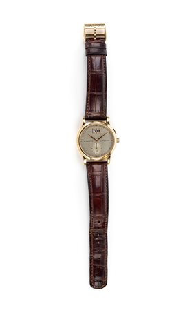 cassa n.136513, movimento n.26546. calibro L.941.3, anni 2000 ca, cassa e fibbia originale in oro 750, ottimo stato d'uso. Fondello con 6 viti, pulsante sulla fascia per la correzione della data, vetro zaffiro. Quadrante dorè opaco con indici in oro giallo applicati, data oversize a 12, quadrante secondario dei secondi. Lancette "alpha" in oro giallo, 30 rubini, scappamento leva lineare, bilanciamento monometallico regolato su 5 posizioni, ammortizzatore, bilanciere piatto autocompensante, rubinetto di bilanciamento inciso. Quadrante, cassa 34 mm e movimento firmati.