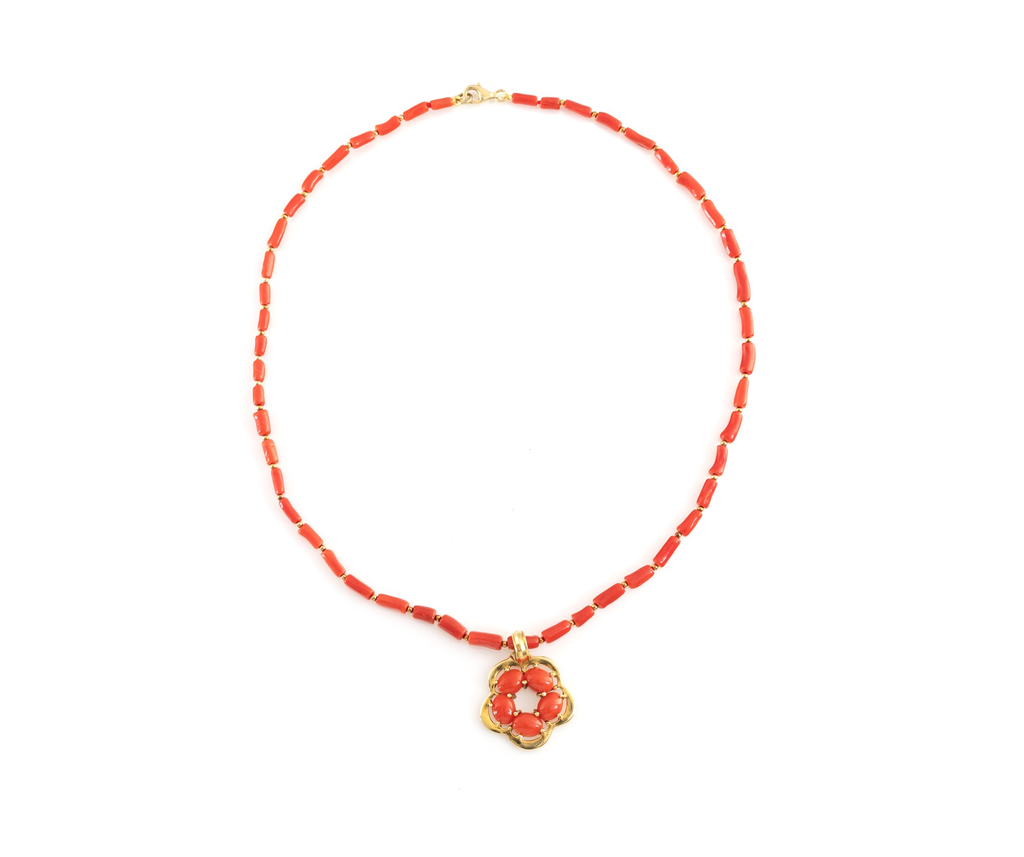 con pendente di fiore in coralli cabochon, montatura in oro giallo 750, g 17,50